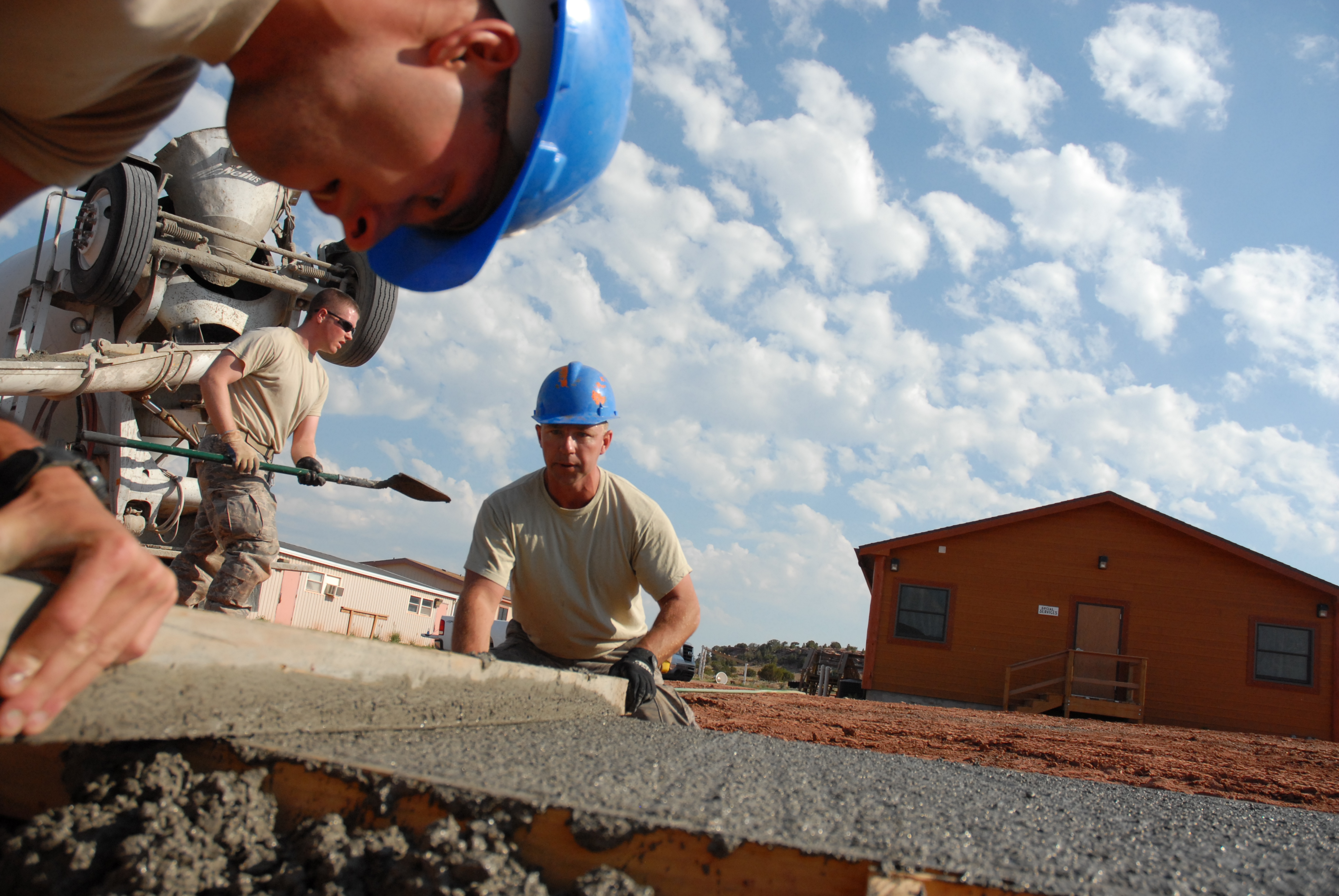 photo 2) U.S. Army photo by Maj. Brad Leighton, 139th Mobile Public Affairs Detachment/ Master Sgt. Gary Wemple of Taylorville smoothes concrete with Senior Airman Leonard Avery of Williamsville, while installing a sidewalk at the Navaho Nation's Adult Program Administration and Daily Life Skills building near St. Michaels, Ariz., June 28. In the background is Staff Sgt. Eric Horn of Lincoln. The Airmen are with the Illinois Air National Guard's 183rd Civil Engineer Squadron, 183rd Fighter Wing in Springfield. The construction is being part of the Air National Guard's Innovative Readiness Training Program in cooperation with the St. Michaels Association for Special Education.