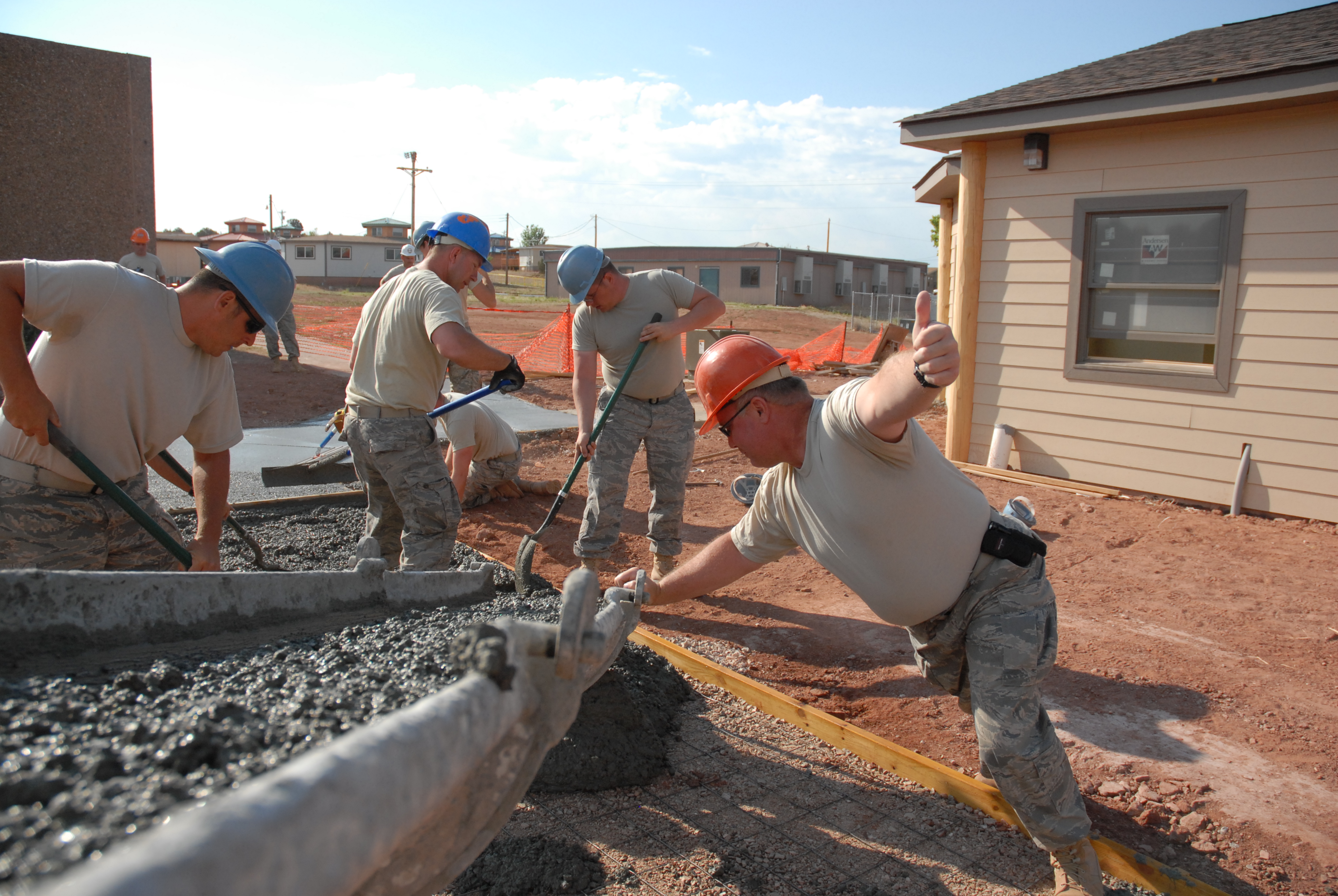 photo 3) U.S. Army photo by Maj. Brad Leighton, 139th Mobile Public Affairs Detachment/ Master Sgt. Christopher Small of Springfield, gives a thumbs up to the concrete truck driver while installing sidewalks at the Navaho Nation's Adult Program Administration and Daily Life Skills building near St. Michaels, Ariz., June 28. To the right of Small is Staff Sgt. Andrew Laning of Saybrook, Master Sgt. Gary Wemple of Taylorville, and Staff Sgt. Eric Horn of Lincoln. The Airmen are members of the Illinois Air National Guard's 183rd Civil Engineer Squadron, 183rd Fighter Wing in Springfield. The construction of the building is part of the Air National Guard's Innovative Readiness Training Program in cooperation with the St. Michaels Association for Special Education.
