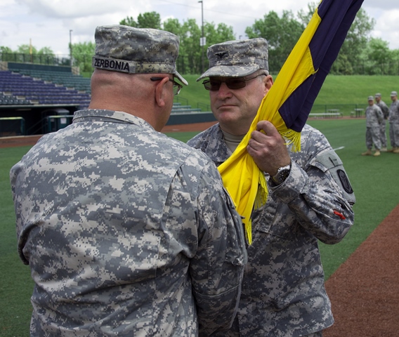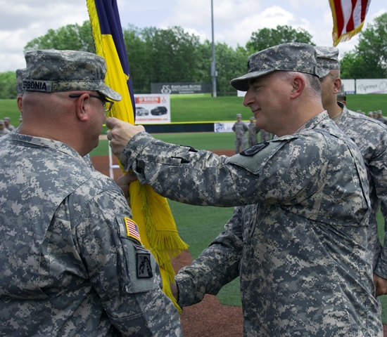 Photo cutline 2: Col. Byron Lloyd of Springfield, Illinois, incoming commander of the 404th Maneuver Enhancement Brigade (MEB) receives the brigade colors from Brig. Gen Michael Zerbonia of Chatham, Illinois, the Land Forces Component Commander for the Illinois Army National Guard, signifying the start of his command. The 404th MEB held their change of command ceremony June 14 at the Corn Crib Stadium in Normal, Illinois. (U.S. Army National Guard Photo by Staff Sgt. Bryan Spreitzer, Illinois National Guard Public Affairs)