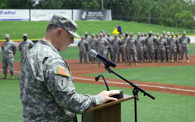 Photo cutline 3: Col. Troy Phillips of Springfield, Illinois, outgoing commander of the 404th Maneuver Enhancement Brigade (MEB), addresses the Soldiers of the MEB during their change of command ceremony June 14 at the Corn Crib Stadium in Normal, Illinois. Phillips told his Soldiers that it had been an honor being their commander and knows that the brigade will be in good hands with its new commander.(U.S. Army National Guard Photo by Staff Sgt. Bryan Spreitzer, Illinois National Guard Public Affairs)