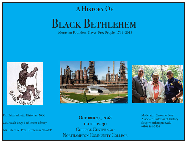 BETHLEHEM, PA (10/17/2018) Northampton Community College (NCC) will host a panel discussion on the history of the city of Bethlehem, PA, and the black people who influenced the city's development from 1741 through present day, including Moravian founders, slaves, and free people. The talk will take place on Thursday, October 25, from 11 a.m. - 12:30 p.m., at the Bethlehem Campus's College Center, second floor, Room CC220, 3835 Green Pond Road, Bethlehem Township.