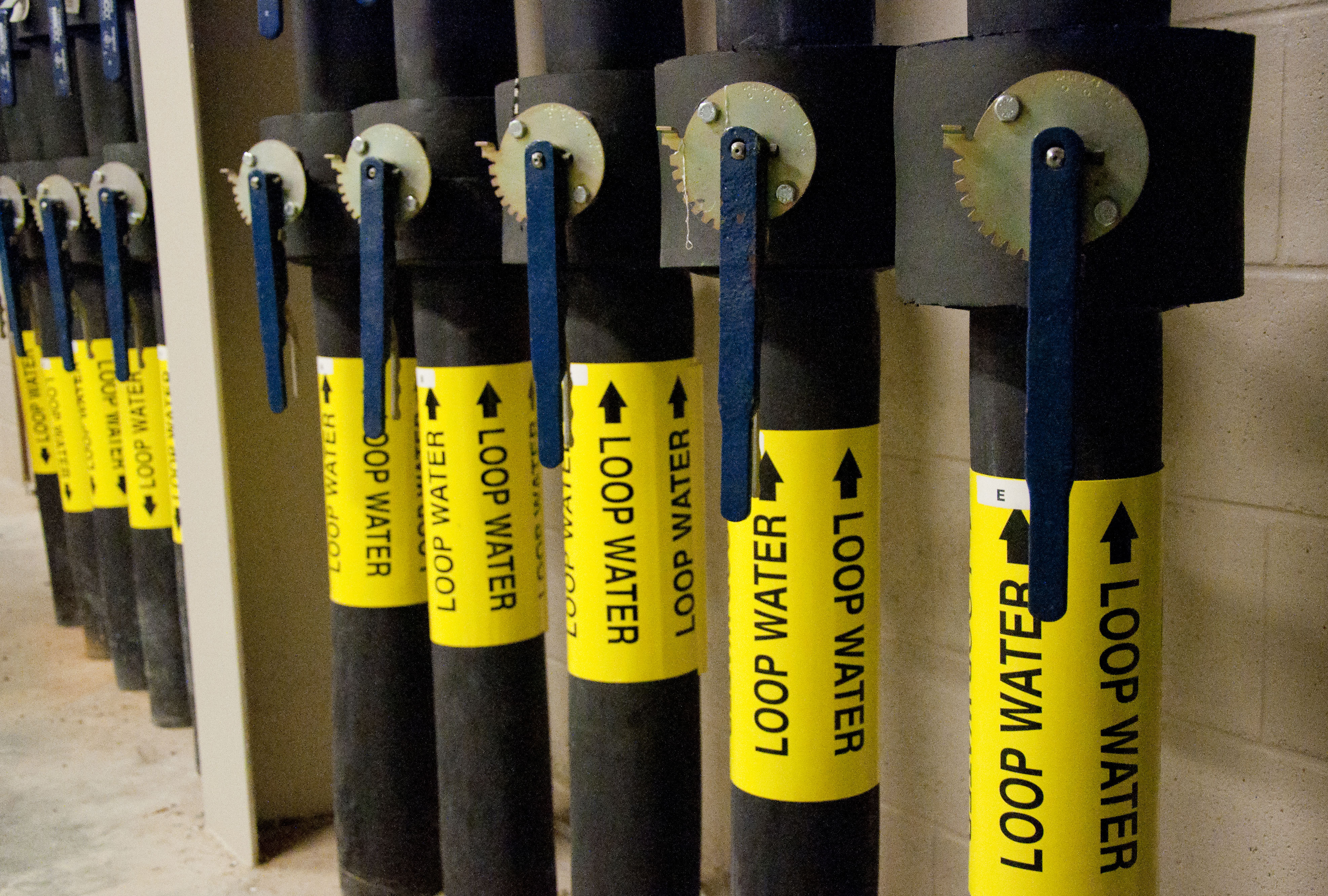 AFRCpipes: Dozens of geothermal pipes reach deep into the ground beneath the building. Air and water are pumped to approximately 300 feet below ground where the temperature is steady. Once the air and water reach optimal temperature, they are pumped back into the building for consumption. This cuts the energy cost per square foot of building space by nearly half. (Photo by Sgt. Brenda Thomas, Public Affairs Office)