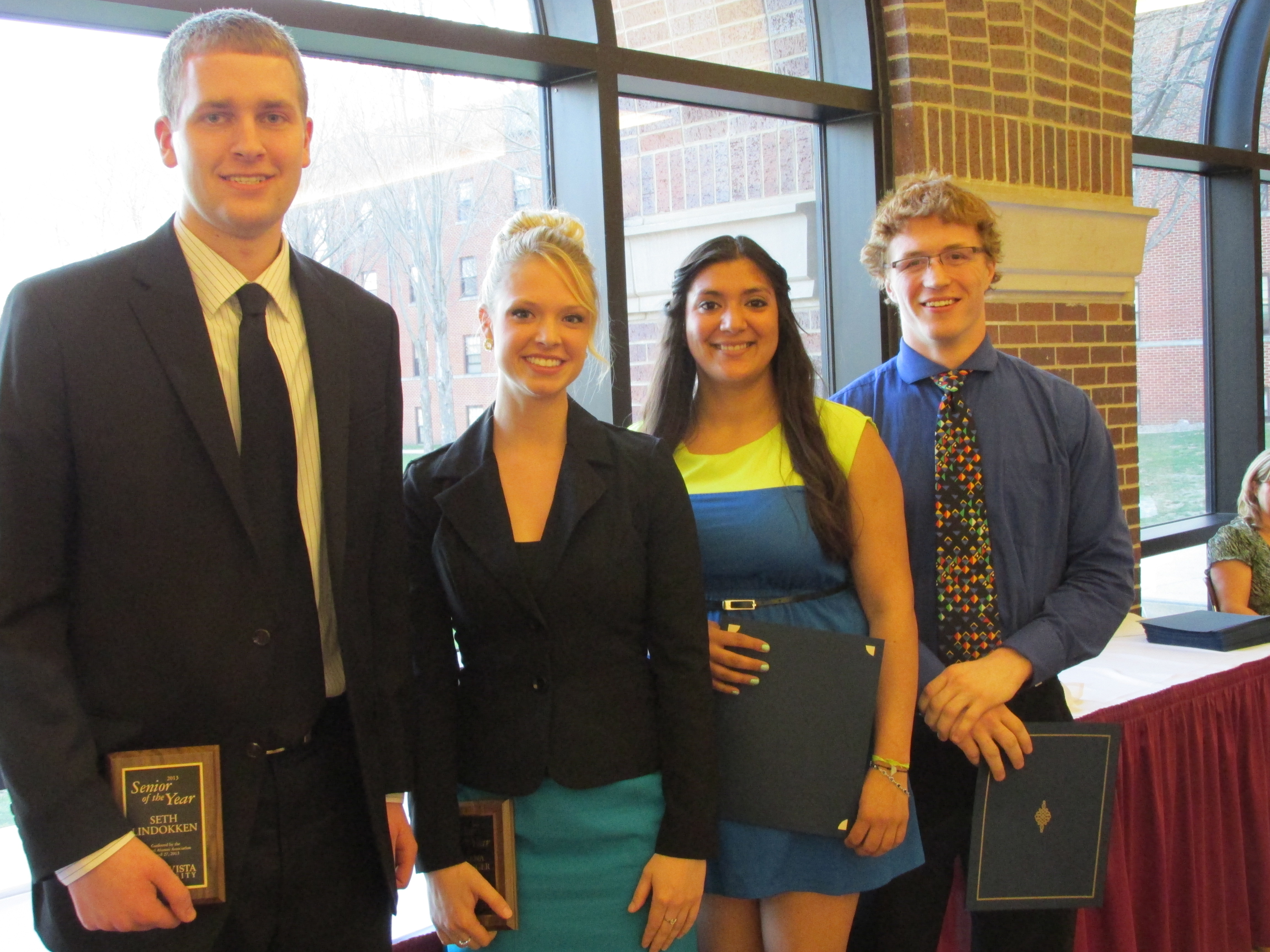 Among the honors were the two "Senior of the Year" awards presented by the BVU National Alumni Association. The students selected were Serena Geisinger, a biology major from Lawton, and Seth Lindokken, a mathematics major from Sibley. Serena will be attending dental school at the University of Iowa this fall. Seth will attend the University of Nebraska in the fall to earn his PhD in mathematics. Other finalists were Kimberly Perez, a biochemistry major from Brownsville, Texas, and Brian Broll, a mathematics education major from Waconia, Minn. Kimberly will pursue a PhD in immunology at the Mayo Clinic in Rochester, Minn. Brian has been accepted to the PhD program in computer science at Vanderbilt University and Rensselaer Polytechnic Institute.
