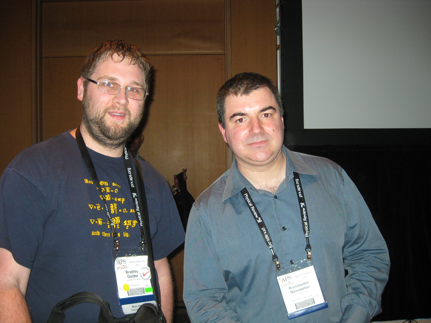 During the APS conference, Mr. Golder also had the opportunity to attend the APS Nobel Lecture, which was given by Dr. Konstantin Novoselov, one of the 2010 Nobel Physics Prize winners. The 2010 Nobel Prize for Physics was awarded jointly to Dr. Novoselov and Dr. Andre Geim of the University of Manchester, United Kingdom, "for groundbreaking experiments regarding the two-dimensional material graphene." Mr. Golder also posed for a photo with Dr. Novoselov at the conference.