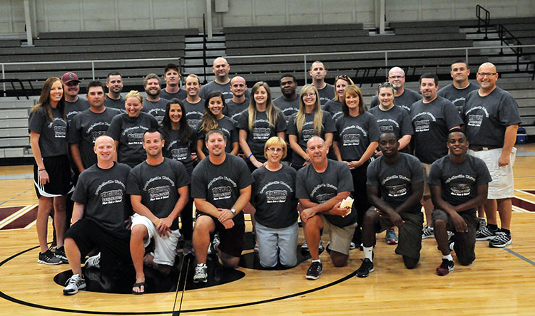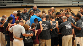 Ed Pavy, Campbellsville University's campus minister, in blue shirt, leads the commissioning prayer during a send off at CU's Powell Athletic Center for the seven-day Costa Rica mission trip. (Campbellsville University Photo by Richard