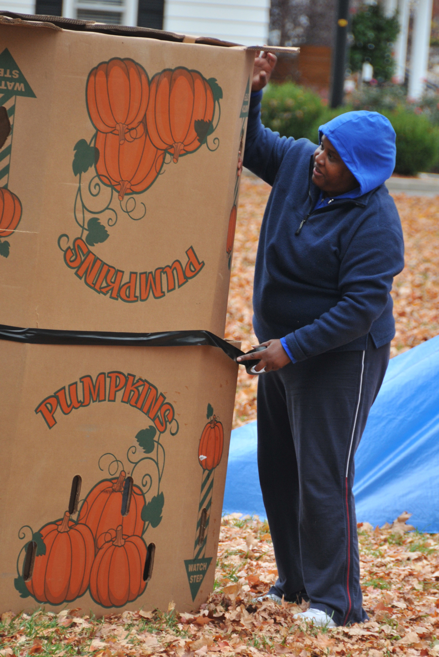 Rosalind Strong-Porter, executive director of Green River Ministries, sets up her cardboard box which will serve as her home for the evening at CU's Cardboard Nation. Photo by Ellie McKinley