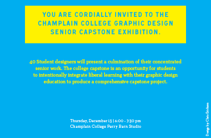 BURLINGTON, VT (12/11/2012)(readMedia)-- To wrap up the fall semester, senior graphic design students are displaying their capstone work on Thursday, Dec. 13. From 6-7:30 p.m., 40 senior designers will present the culmination of their concentrated senior work in the Champlain College Barn Studio (behind Perry Hall on Maple/S. Willard). Director of the Graphic Design and Digital Media Program, Suzanne Glover said that the work to be displayed at the Senior Student Capstone Exhibition this year is incredible. The exhibition is free and open to the public.