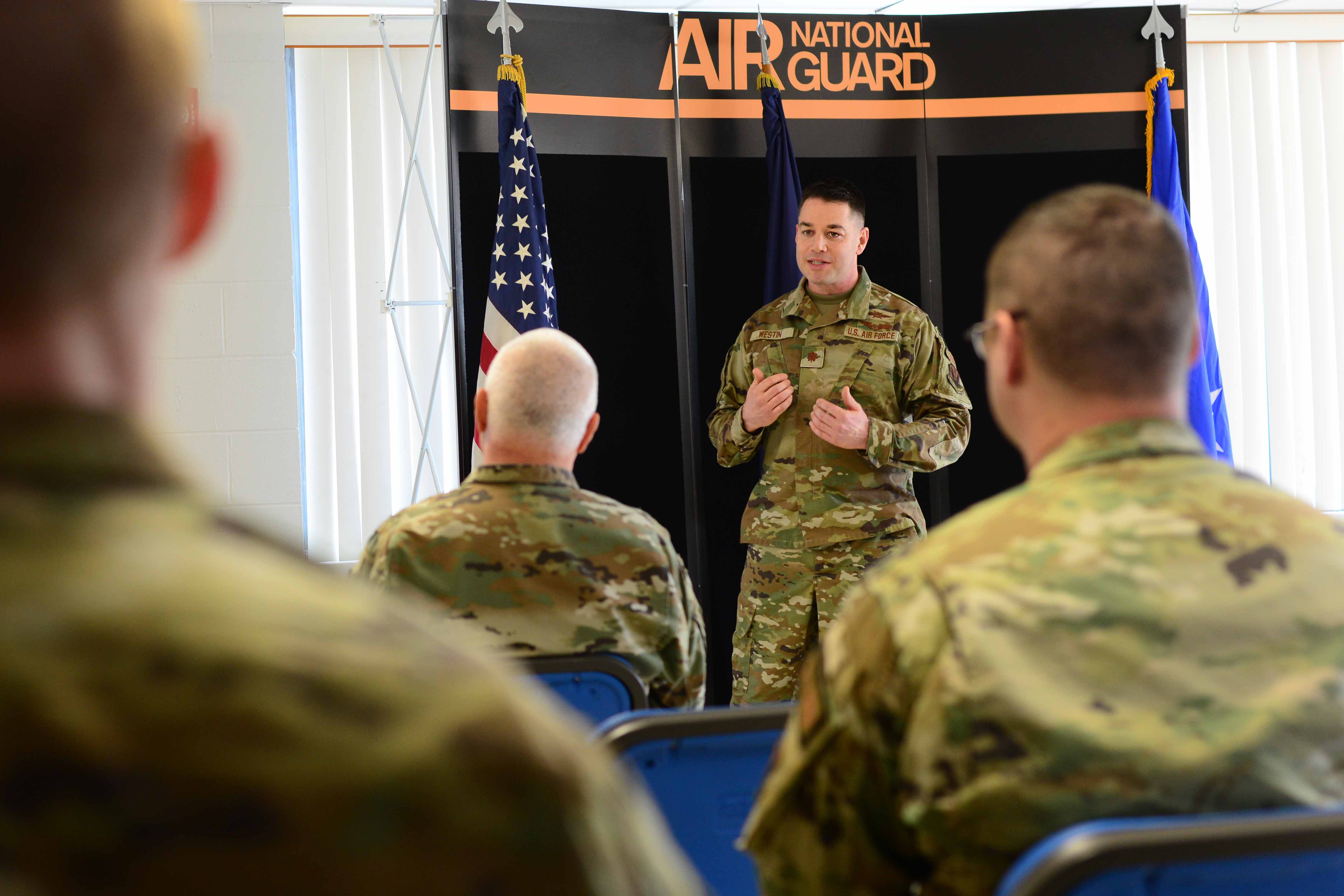 20220306-Z-XE741-003: Maj. Brenden Westin, of New Gloucester, speaks to members of the Maine Air National Guard's 265th Combat Communications Squadron in South Portland during the units change of command ceremony on March 6, 2022. Westin assumed command from Lt. Col. Brian Camire, of Poland Springs, who commanded the 265th since May 2016. (Maine Air National Guard photo by Master Sgt. Travis Hill)