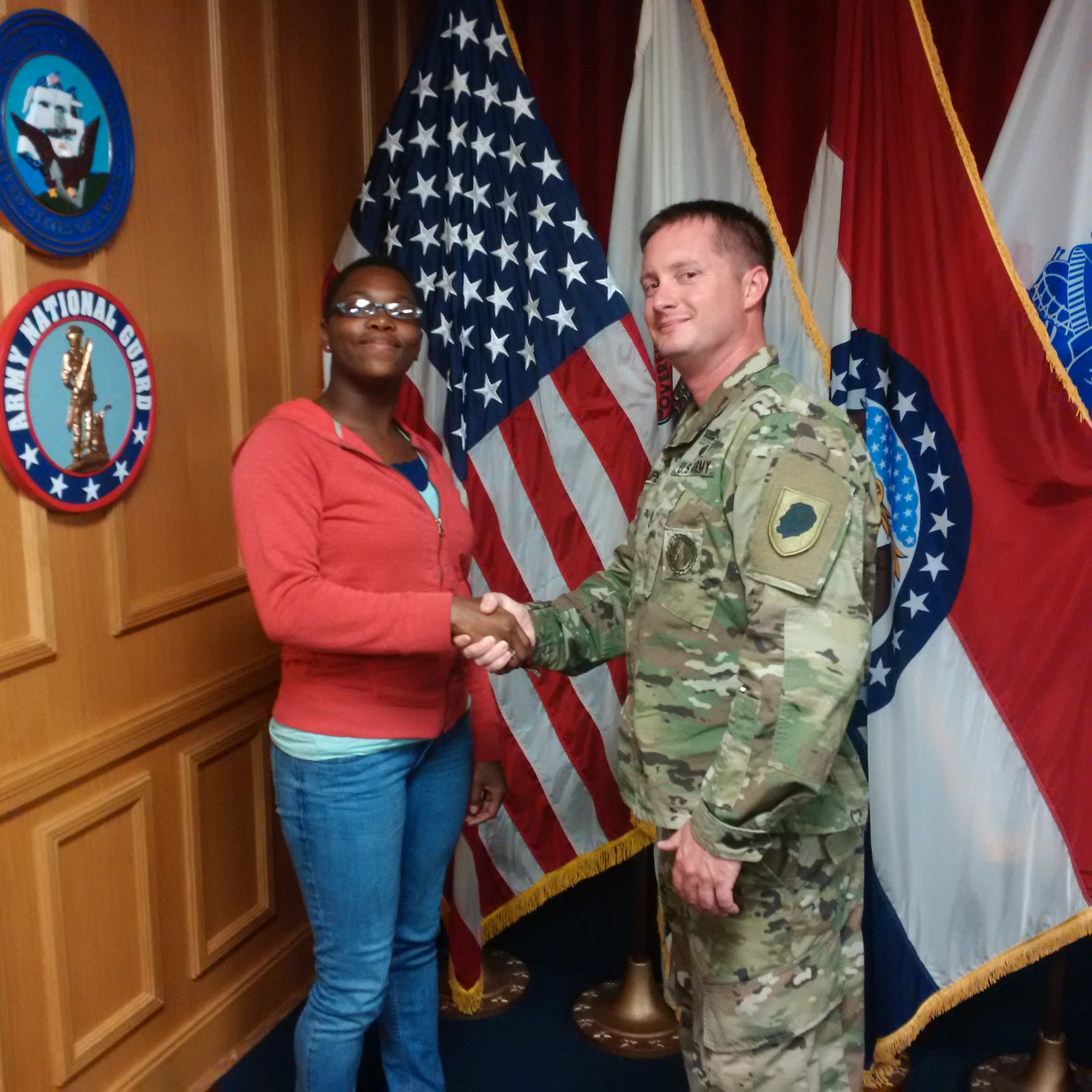 Cutline: Pfc. Marnika Harris (left), of Collinsville, Illinois, shakes hands with her recruiter, Staff Sgt. Ty Lipe, of Edwardsville, Illinois, after she enlisted into the Illinois Army National Guard July 7. Harris will be assigned to the Shiloh-based M Company as a Automated Supply Specialist. Harris will attend Basic Combat Training at Fort Jackson, North Carolina and then attend Advanced Individual Training at Fort Lee, Virginia.