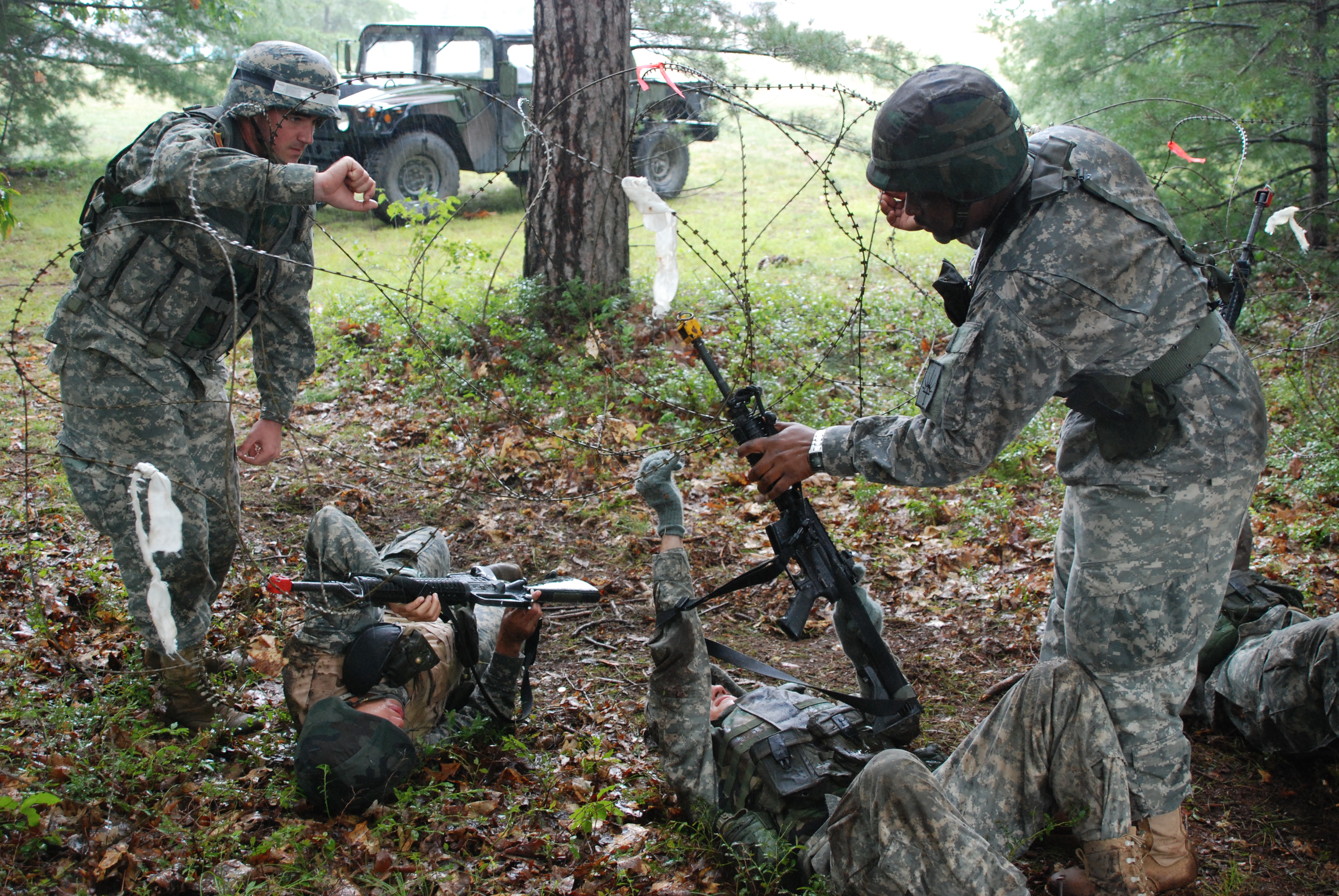 Cpl. Nicholas Sbano, a New York Pre-Mobilization Assistance Element Officer Controller/Trainer, and Spc. Leslie Thomas, an assistant instructor, aid deploying Soldiers in moving through a barbed wire obstacle course at Ft. Drum on August 8, 2008.