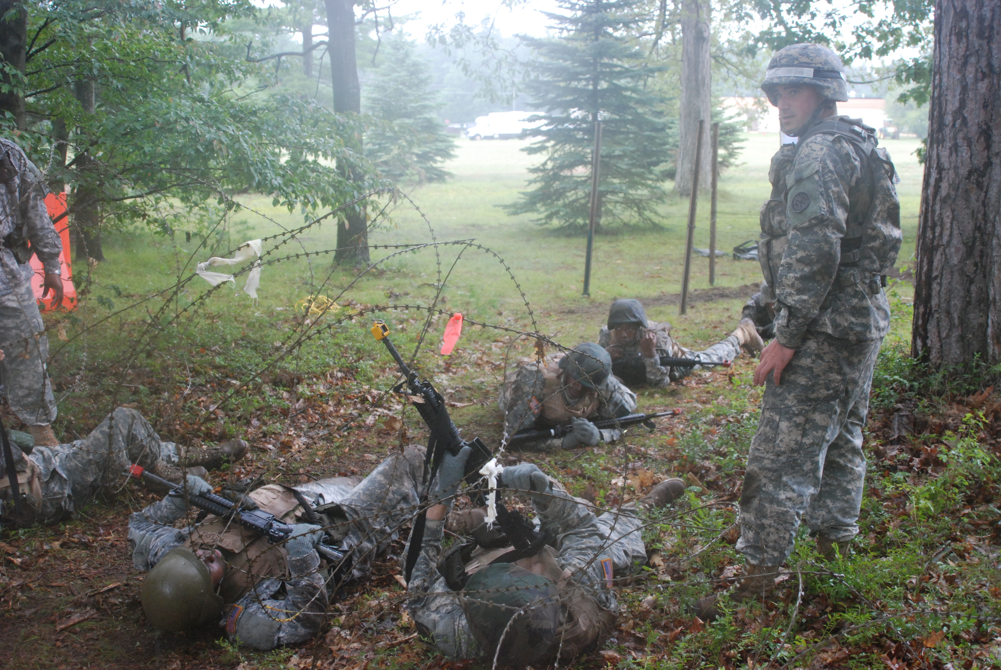 Cpl. Nicholas Sbano, a New York Pre-Mobilization Assistance Element Observer Controller/Trainer, supervises deploying Soldiers in moving through a barbed wire obstacle course at Ft. Drum on August 8, 2008.