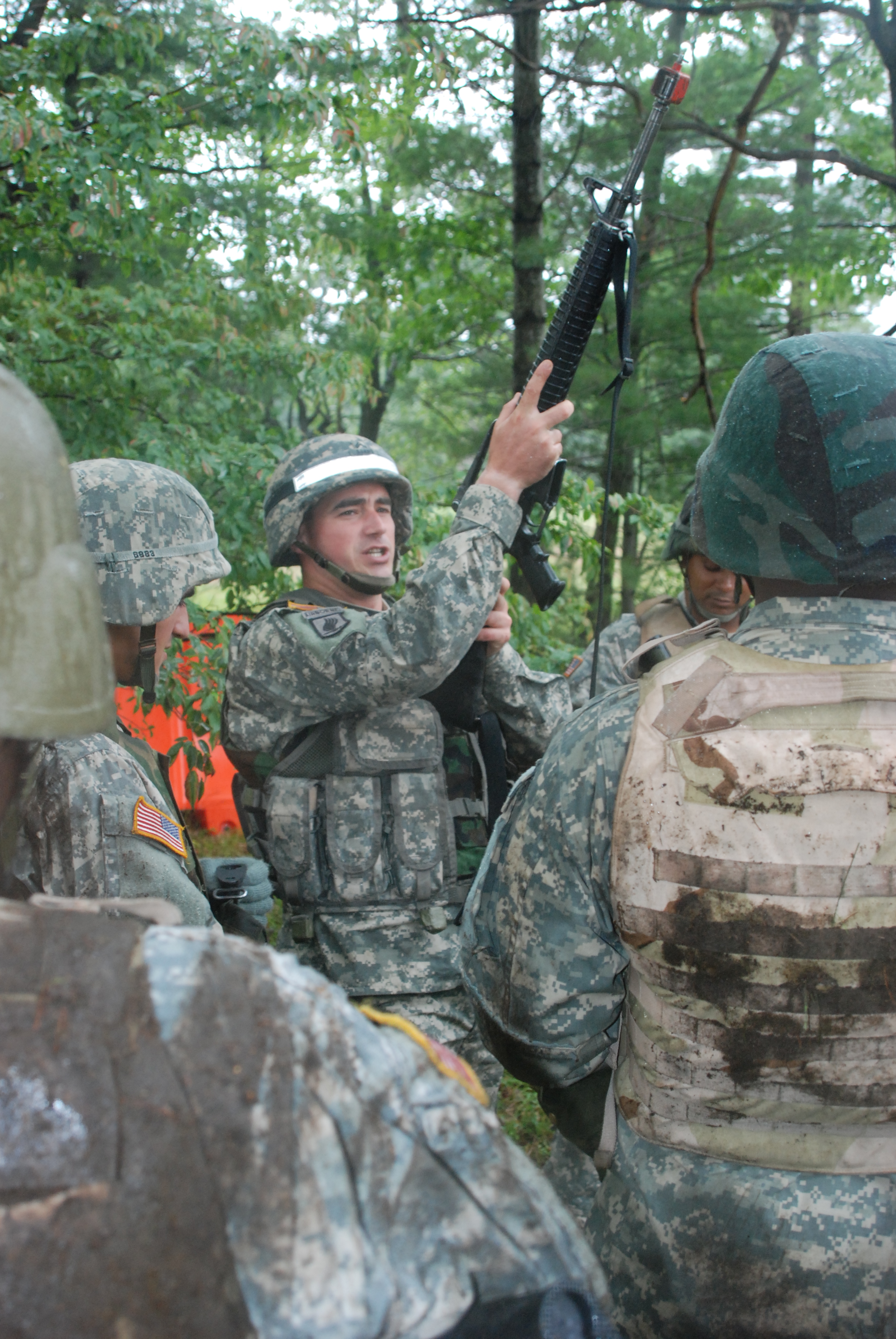Cpl. Nicholas Sbano, a New York Pre-Mobilization Assistance Element Observer Controller/Trainer, discusses proper procedures before moving deploying Soldiers through a barbed wire obstacle course at Ft. Drum on August 8, 2008.