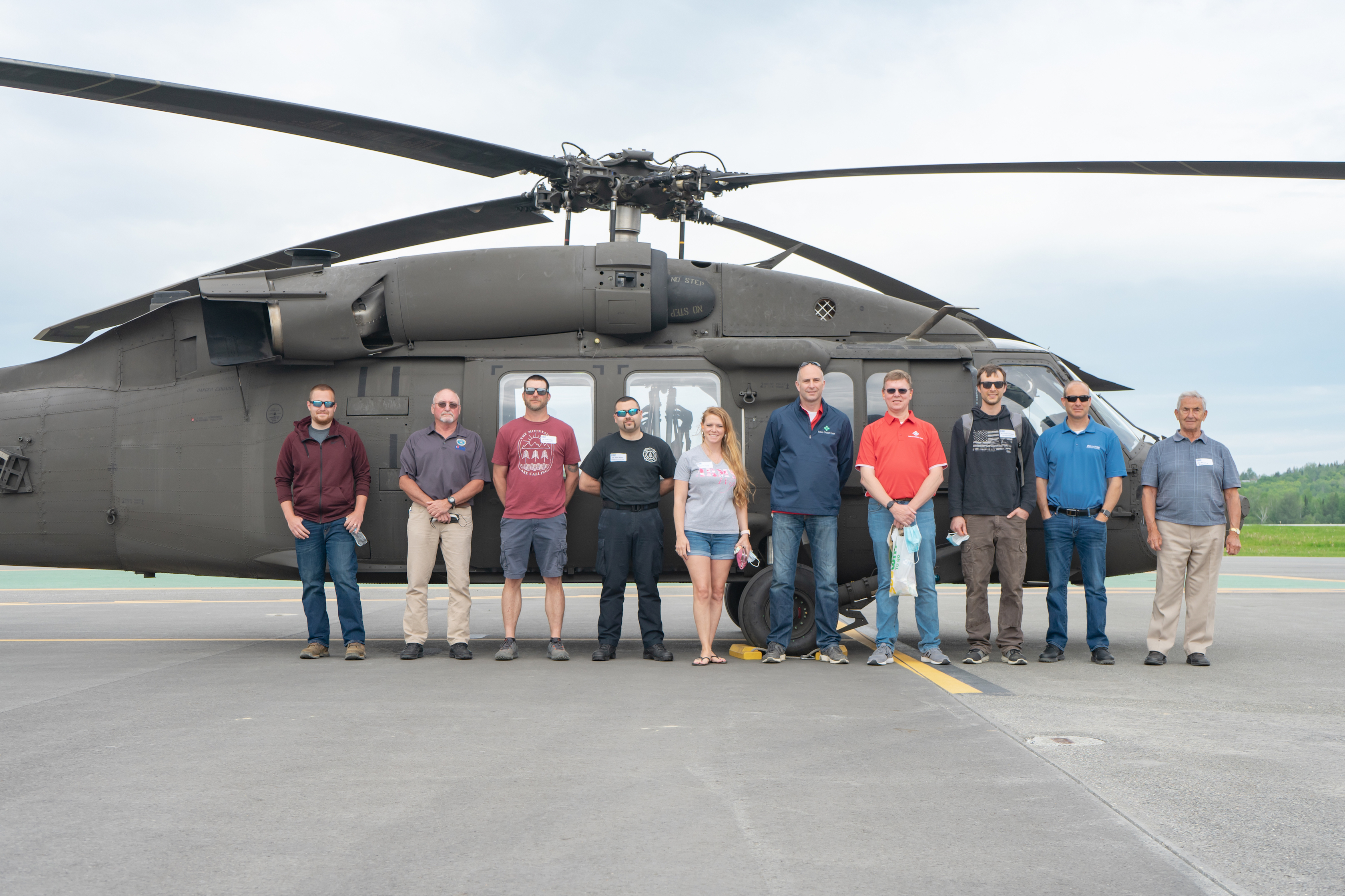 005:Employers pause for a photo prior to boarding a UH-60 Black Hawk helicopter as part of the 185th Engineer Support Company's boss lift event June 5, 2021, in Presque Isle. In addition to the flight, employers had the opportunity to meet unit and state level leaders, take part in a virtual weapons training simulation, view unit training demonstrations, and tour the new Northern Maine Readiness Center. The 185th is in the early stages of occupying the new headquarters building which began construction in 2018. Maine National Guard photo by Sgt. Darin Douin / Released