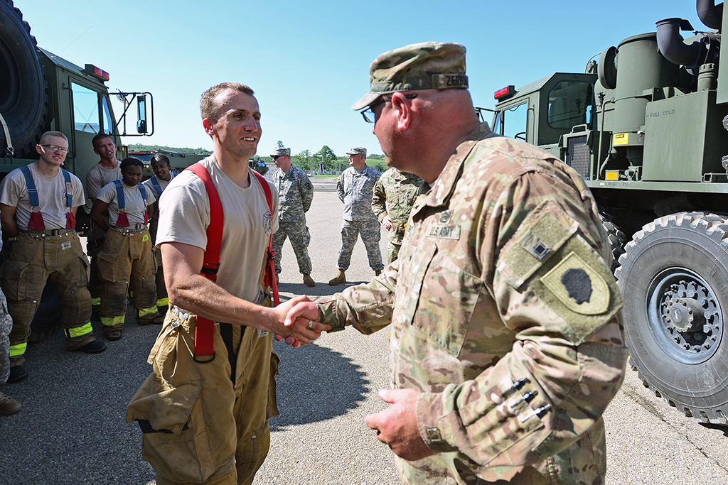 Photo Cutline 5: Brig. Gen. Michael Zerbonia of Springfield, Illinois the Assistant Adjutant General – Army, Illinois National Guard, gives one of his coins to Sgt. Jarrod Pochynok of Springfield, Illinois, for displaying all the qualities of an exceptional non-commissioned officer July 25 during the Sparta, Illinois, based 615th Fire Fighting Detachment's annual training. Zerbonia gives his coins to Soldiers to recognize them for their achievements and exceptional service. Pochynok works as an industrial fire fighter in Grantite City, Illinois, for his civilian career. (U.S. Army photo by Staff Sgt. Robert R. Adams, Illinois National Guard Public Affairs)