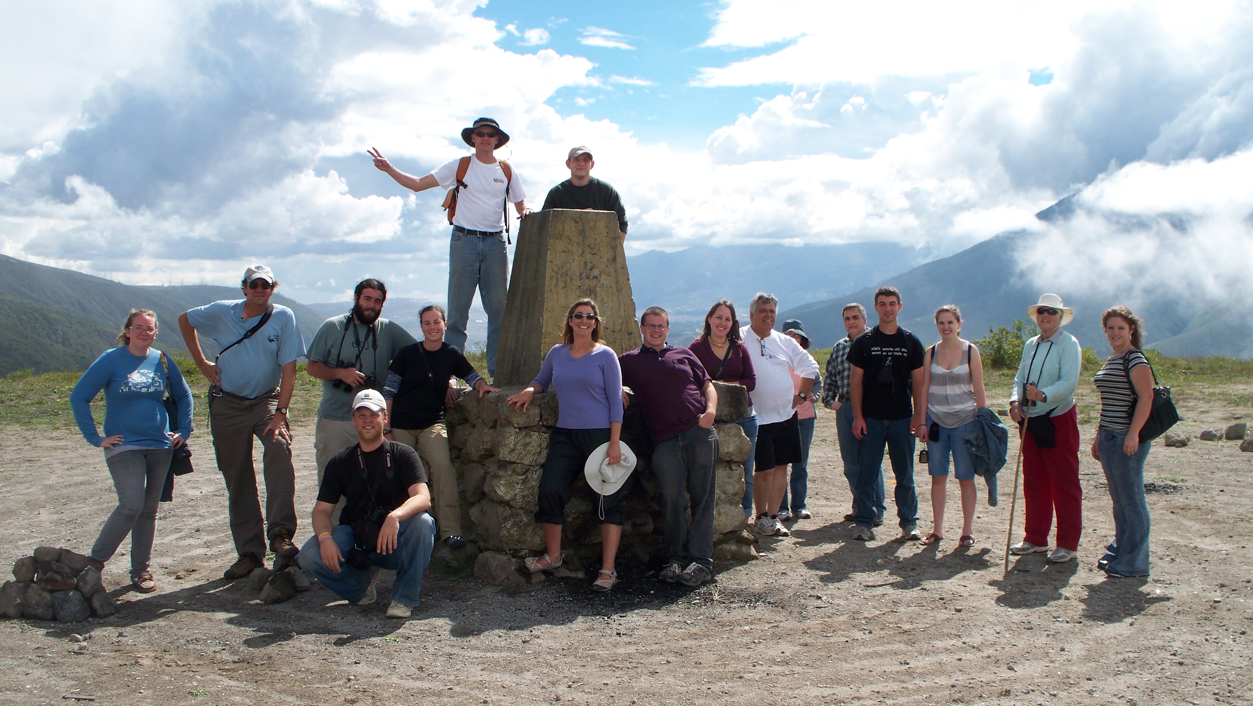 They also visited a stone monument denoting the location of the equator at the ancient archeological site of Catequilla, high up in the Andes Mountains in Ecuador, as seen in the photo below. Seen posing, are, from left: Mary Brunet, Glenn Johnson, John Armitage (kneeling), James Flaherty, Angela Ross, Christa Kelson, Kevin O'Neill, Michelle Davis, Steven Marqusee, Eileen Marqusee, Greg Holland, Joseph Valenti, Jennifer Dawson, Sheila Cerwonka and Stephanie Scribner. At top are Christopher Kelson and Brendan Brady.