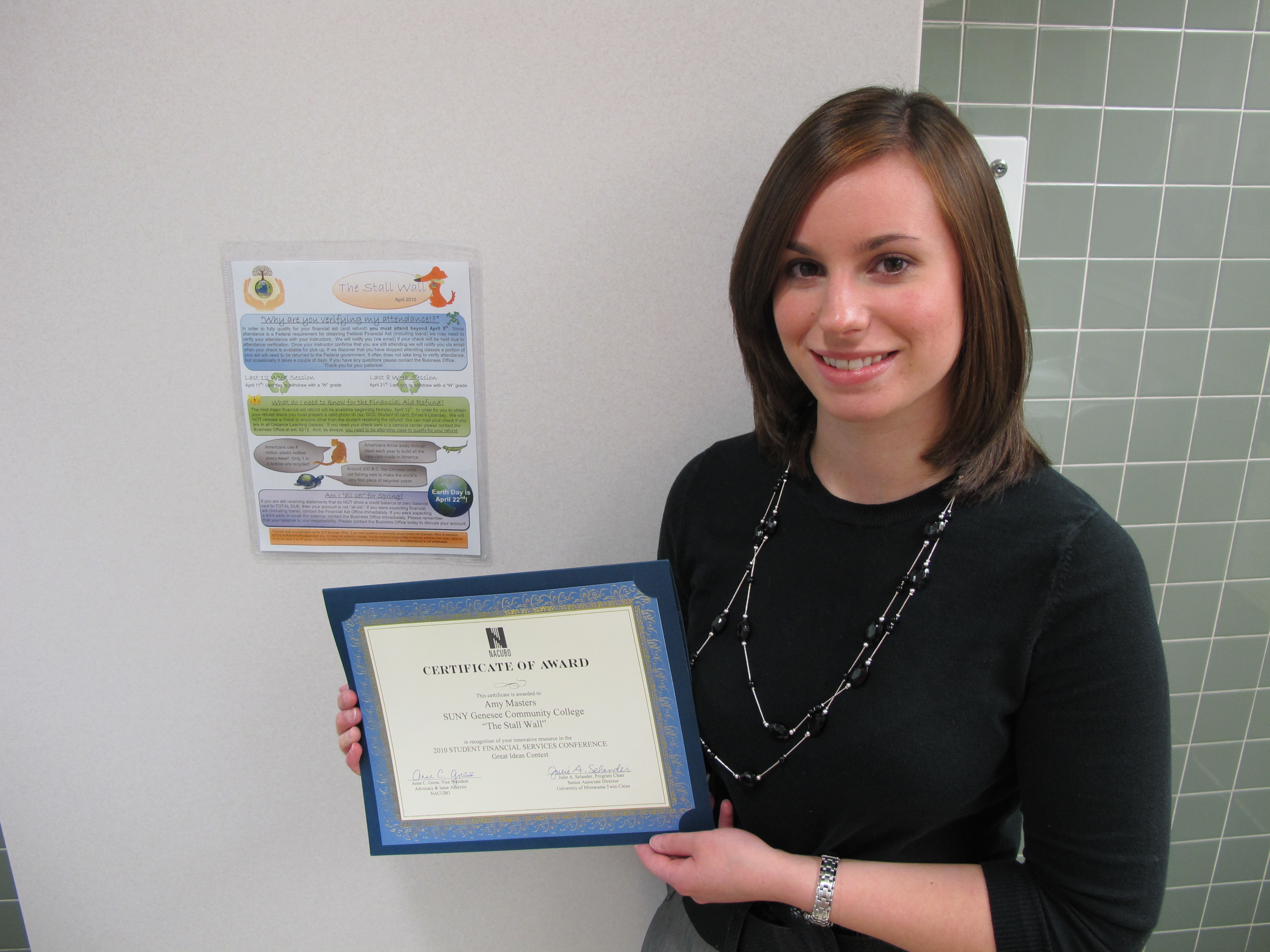BATAVIA, NY (04/08/2010)(readMedia)-- Genesee Community College Business Office Financial Specialist Amy Masters was recently honored at the National Association of College and University Business Officers (NACUBO) 2010 Student Financial Services Conference. The conference was held March 14-16, 2010 in San Antonio, Texas. The Business Office's publication of "The Stall Wall" earned Amy first place in the "Great Idea Contest".