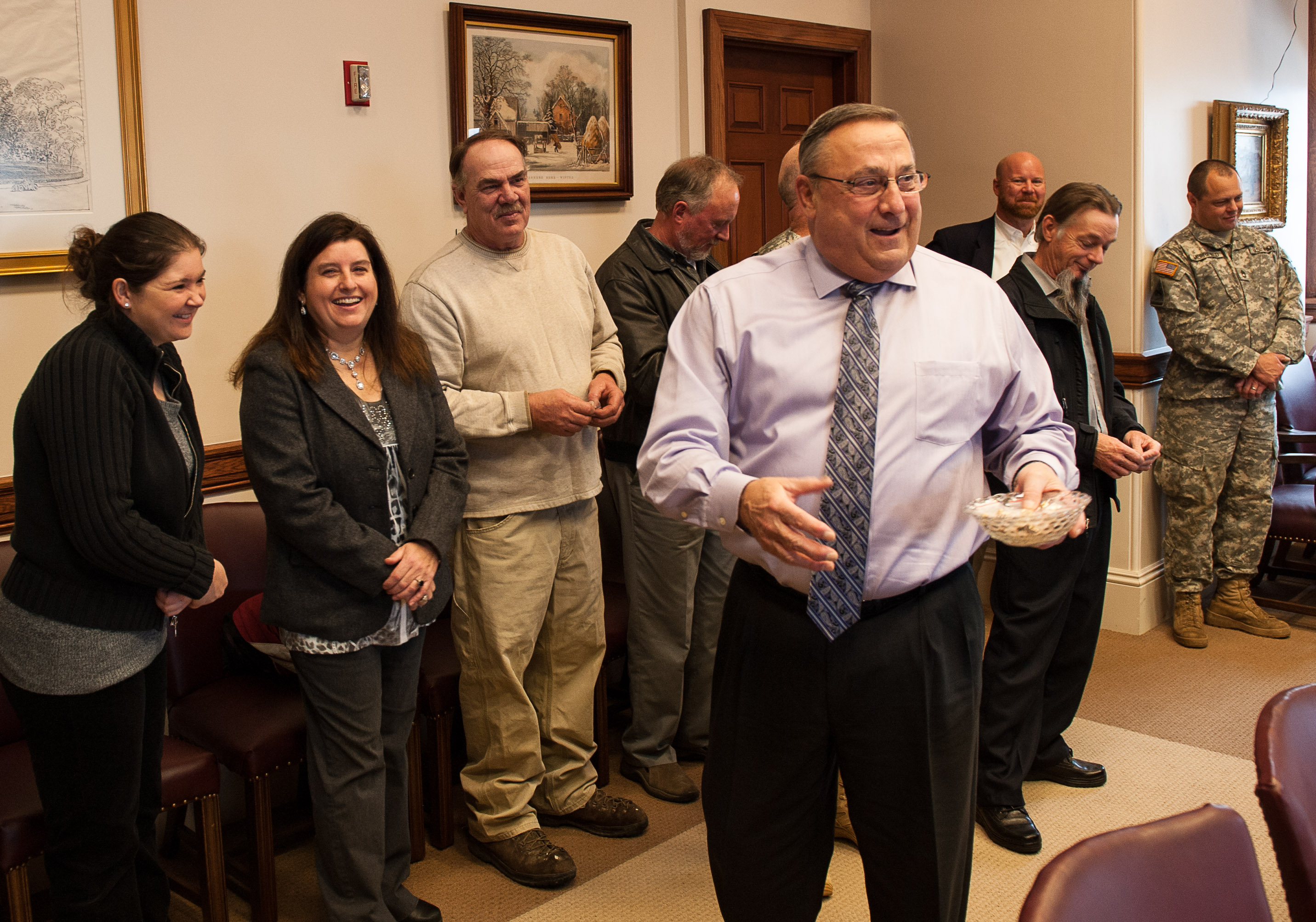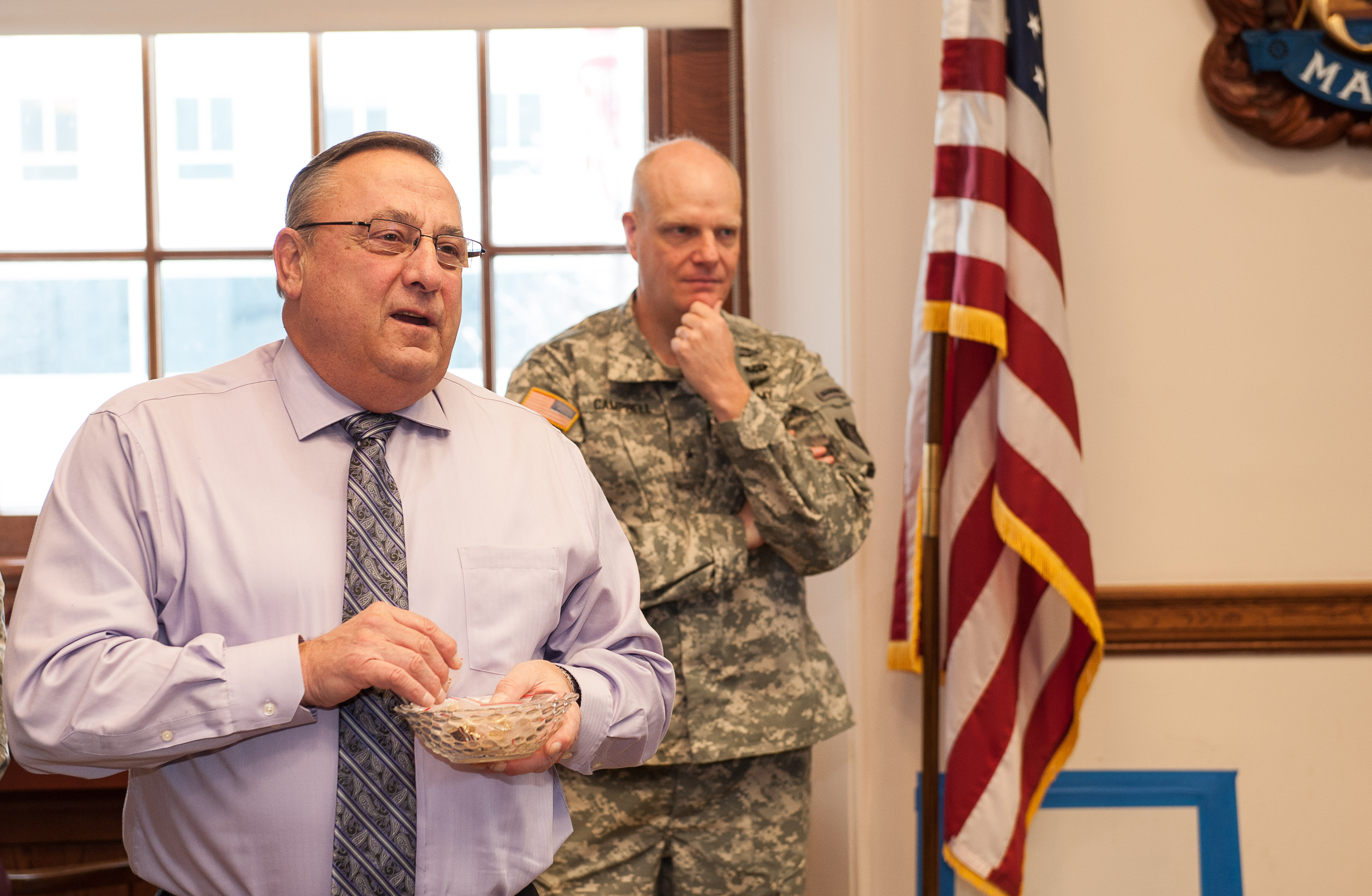 Governor Paul LePage provides a moment of levity while recognizing the hard work of and fiscal stewardship of Maine Army National Guard employees at a ceremony at the state capital Friday, Nov. 14