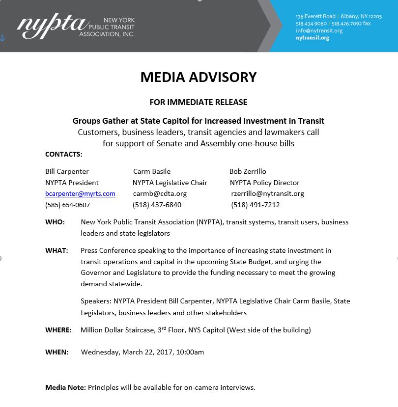 ALBANY, NY (03/21/2017) (readMedia)-- Please join us this Wednesday, March 22 at the NYS Capitol as we speak to the importance of increasing state investment in transit operations and capital in the upcoming State Budget.