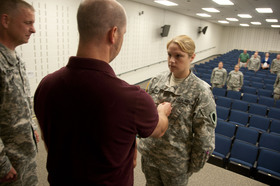 U.S. Army National Guard photo by Staff Sgt. Michael Camacho, Illinois National Guard Public Affairs/ Scott Miller of Havana, Ill., promotes his wife, Heather Miller of Havana, Ill., to the rank of sergeant first class Aug. 1 at Camp Lincoln in Springfield, Ill. Miller has served in the Illinois Army National Guard since July 2000.