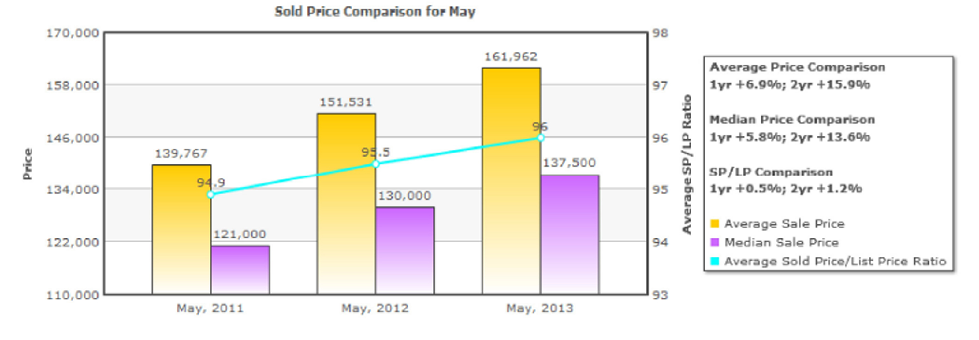 The median sale price jumped by $7,500 or 5.8 percent. The median sale price was $130,000 in May 2012 and $137,500 this May. The average sale price also went up 6.9 percent. The average sale price was $151,531 in May 2012 and $161,962 in May 2013.
