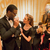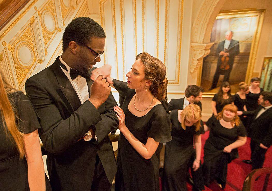 Elizabeth Mirandi (right) helps Shavon Lloyd make final adjustments as they prepare to walk on to the Carnegie Hall stage. Both were featured soloists in Vaughn Williams’ “Serenade to Music."