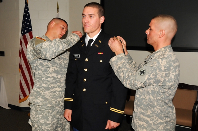 Second Lt. Joshua Meyer of Springfield joined the Illinois Army National Guard during his last semester of graduate school at Western Illinois University. He was pinned by his two brothers who are both serving in the Illinois Army National Guard and received his first salute from his sister, formerly a specialist in the Illinois Army Guard.