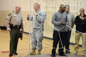 (Left) Michael Zerbonia, Colonel of Operations for the Illinois State Police, listens to Staff Sgt. Joseph Arnold of Pleasant Hill, Illinois, as he describes the team building exercise he is instructing to approximately 60 Illinois State troopers at the Illinois Military Academy in Springfield, Illinois, Oct. 9. Arnold is an intelligence analyst with the Illinois National Guard Counterdrug Task Force that conducted a team-building exercise during the troopers' weeklong leadership training. (U.S. Army National Guard photo by Sgt. 1st Class Kassidy L. Snyder, Illinois National Guard Public Affairs)
