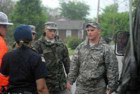 photo 1) U.S. Army photo by Spc. Christopher Garibay, 33rd Infantry Brigade Combat Team Public Affairs/ Sgt. Randy R. Frank of Carterville, team leader with the 2nd Battalion 130th Infantry Regiment collaborates with Spc. Jason Napiorkowski of Marion, Spc. Michael Lasseter of Harrisburg, and local law enforcement to ensure complete accountability of residents in their quadrants. Illinois National Guardsmen conducted evacuation notifications across Cairo after storms have threatened the city with high flood levels.