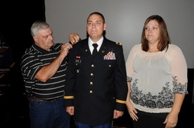 U.S. Army photo by Staff Sgt. Kassidy L. Snyder, Illinois National Guard Public Affairs/ Vietnam veteran Lou Ritter of Muscatine, Iowa, pins second lieutenant rank on his son, Aaron Ritter of Oak Run, as Aaron's wife Sarah stands next to him during the Illinois Army National Guard's Officer Candidate School Commissioning Ceremony at Springfield High School in Springfield, Aug. 26.