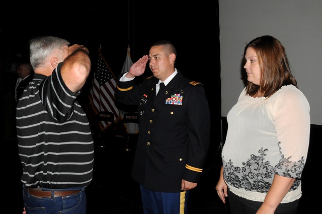 Second Lt. Aaron Ritter of Oak Run, receives his first salute from his father, retired Vietnam veteran Lou Ritter of Muscatine, Iowa.