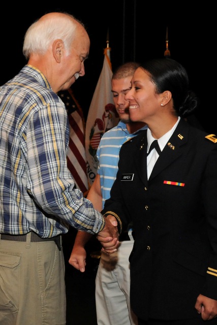 Vietnam veteran John Niemeyer of St. Louis, Mo., receives a coin from his daughter, 2nd Lt. Marivon Ampier of Fairview Heights, after saluting her for the first time.