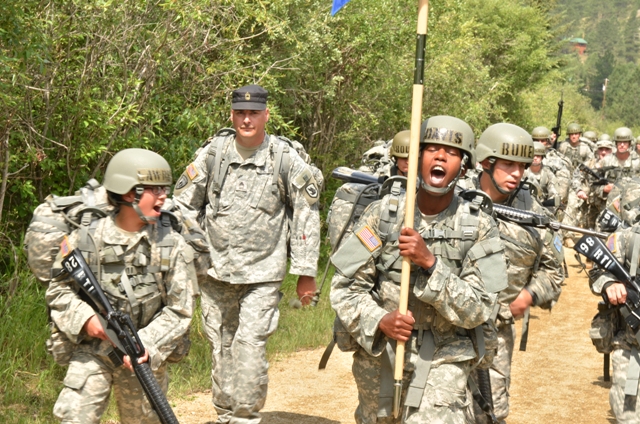 U.S. Army photo by Sgt. Andrew Turner, South Dakota Army National Guard/Illinois Army National Guard Officer Candidate Rebecca Davis of Springfield with the 129th Regional Training Institute in Springfield, motivates fellow officer candidates at the end of the 10-mile foot march in July at Accelerated Officer Candidate School at Fort Meade, S.D. Davis is a teacher at Springfield High School in her civilian life.