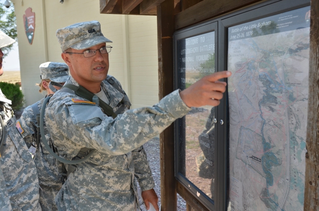 U.S. Army photo by Sgt. Andrew Turner, South Dakota Army National Guard/ Illinois Army National Guard Officer Candidate Patrick Clark of St. Louis with the 129th Regional Training Institute in Springfield, points to an area of the Little Bighorn Battlefield after finding it on a map at the Little Bighorn Battlefield National Monument June 4 during Accelerated Officer Candidate School at Fort Meade, S.D. Students visited the Little Bighorn Battlefield as part of their professional education to become commissioned officers in the Army National Guard.