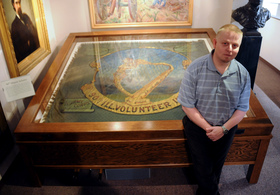 U.S. Army photo by Sgt. Michael Camacho, Illinois National Guard Public Affairs Office/ Bill Lear of Springfield, curator of the Illinois State Military Museum stands by the new flag display. The display will showcase war flags and banners from the Mexican War to present day overseas operations.