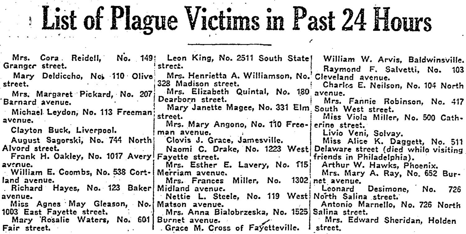 Unfortunately, the need to send Soldiers to local hospitals resulted in spreading the illness to Syracuse itself. By October 4, 8,000 Syracuse residents were sick and the Syracuse Herald was running a daily list of "plague victims." By the time the epidemic ended, 900 Syracuse residents had died.