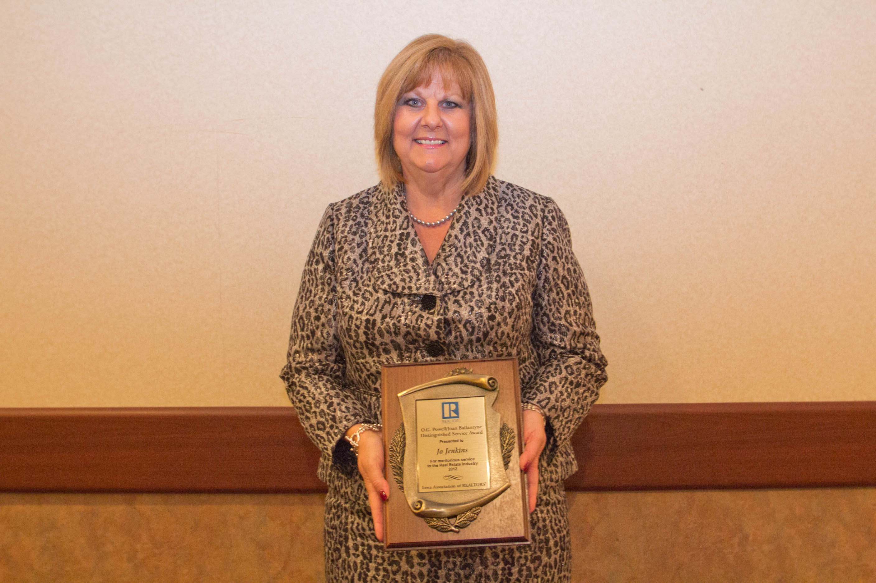 CLIVE, IA (10/23/2012)(readMedia)-- The Iowa Association of Realtors® (IAR) congratulates Jo Jenkins of Newton, this year's recipient of the O.G. Powell/Joan Ballantyne Distinguished Service Award. The award was presented at the IAR Inaugural Gala held Sept. 26 in Ames.