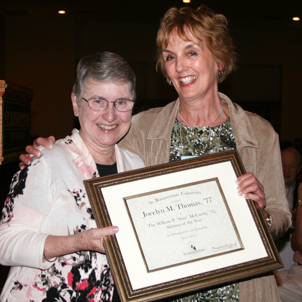 Thomas, a 1977 graduate, was presented the William "Stax" McCarthy Award. Named in memory of the former annual fund and alumni director, the award is presented annually to graduates whose continued service to the university reflects the spirit of St. Francis, St. Bonaventure and St. Clare.