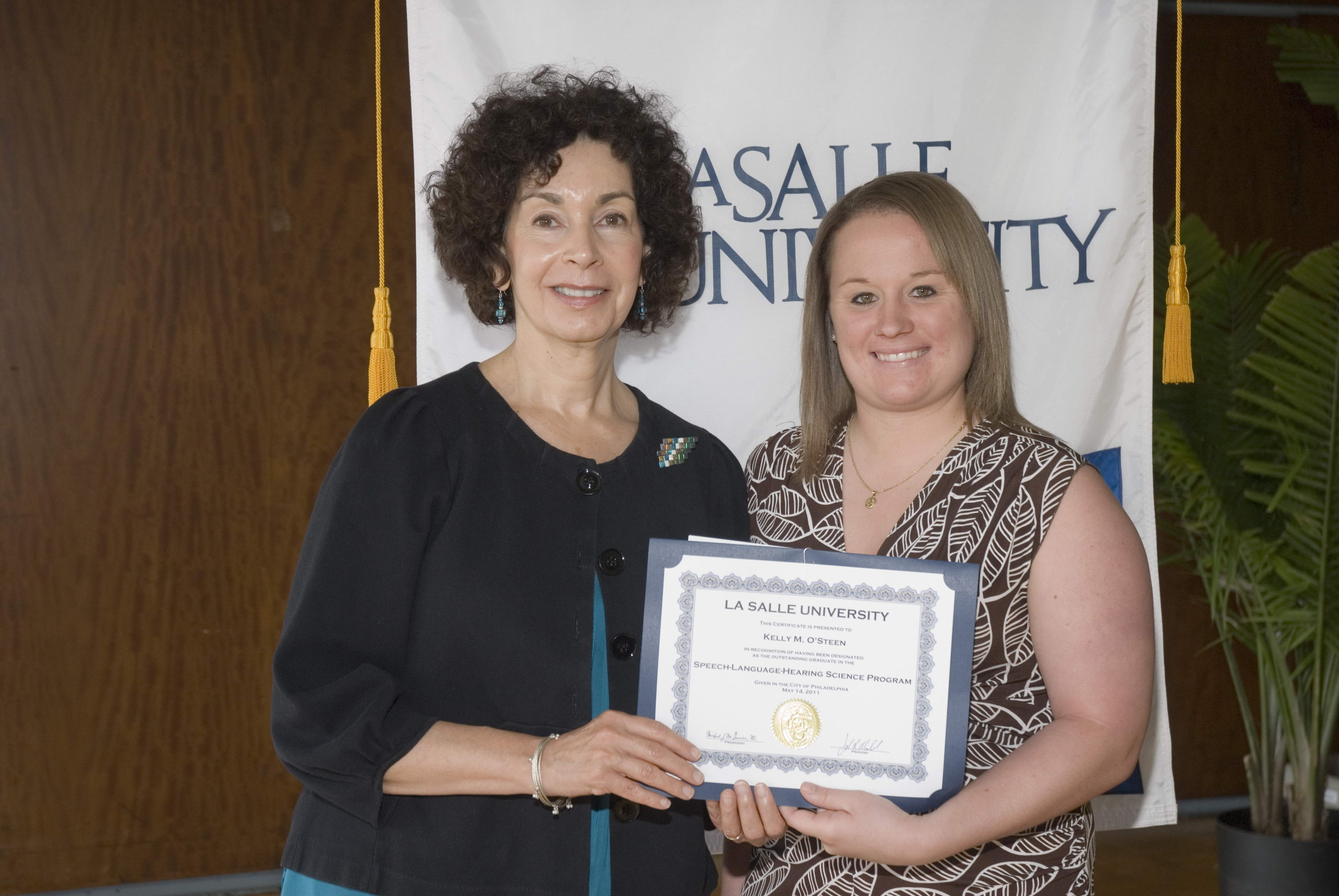 PHILADELPHIA, PA (06/20/2011)(readMedia)-- Kelly O'Steen of Dunkirk was named the top graduating student in the speech-language-hearing science program at La Salle University in Philadelphia. When presented with the honor, Dr. Barbara Amster, Director of La Salle's Speech-Language-Hearing Science Program said, "Kelly is a true leader among her peers and in class. She tackled challenges with great interest and no task seemed insurmountable. She was highly regarded by her classmates within the SLHS Program as someone who was academically talented and was willing to share her knowledge for the benefit of others. She enthusiastically helps her peers and was happy to do so. During all classes she was often first to raise her hand to either ask a thought-provoking question or provide an intelligent answer. Outgoing, talented, and hard-working, Kelly did all this while playing Division 1 soccer at La Salle. As a student-athlete, she has effectively balanced the demands of academics and sports. In addition, she was eager to participate at the Deaf Olympics in Taiwan. Having a bilateral hearing impairment has never stood in Kelly's way. In fact, this made her even more interested in the subject of speech-language-hearing science. Being very committed as a student in her coursework and clinical experiences, we have no doubt that Kelly will be a true asset to the profession of communication sciences and disorders."