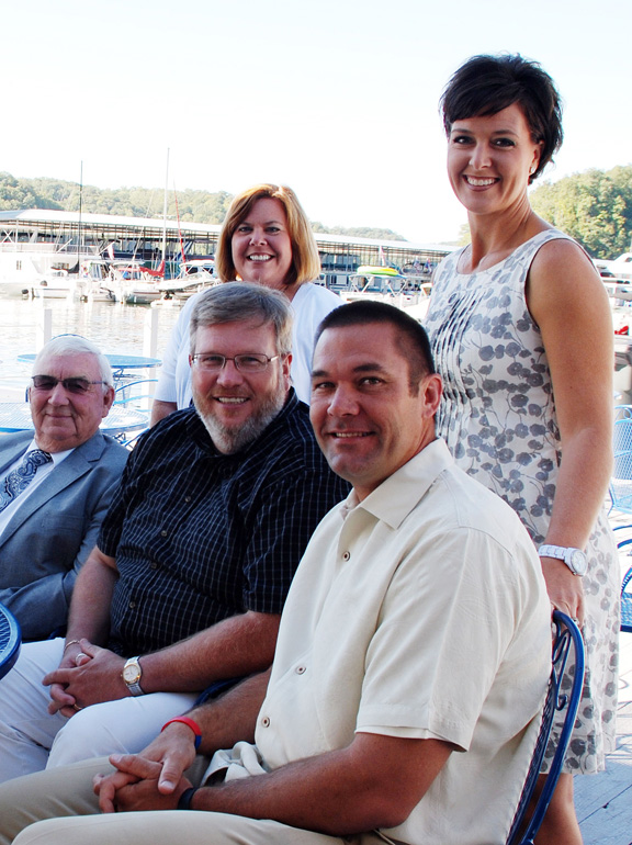 Attending the Labor Day anniversary lake service at Jamestown Marina were from left, seated; Rabon Smith, Pastor Jeff Eaton and Pastor Rick Mann. In back are Julie Winn Eaton, left, and Susan Branscum Mann. (Campbellsville University Photo by Linda Waggener)
