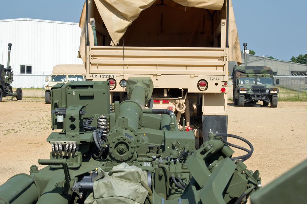 Cutline 1: An M777, 152mm Howitzer sits behind a 2nd Battalion, 122nd Field Artillery Medium Tactical Vehicle during fielding and inventory at Fort McCoy, Wisconsin July 15. Recently, the 122nd Field Artillery underwent a reorganization, gaining a new C Battery along with new M777 Howitzers, upgraded M119A3 Howitzers, and new counter-mortar radar systems. The battalion chose to field their new equipment during their annual training period at Fort McCoy. (U.S. Army National Guard photo by Staff Sgt. Bryan Spreitzer, Illinois National Guard Public Affairs)