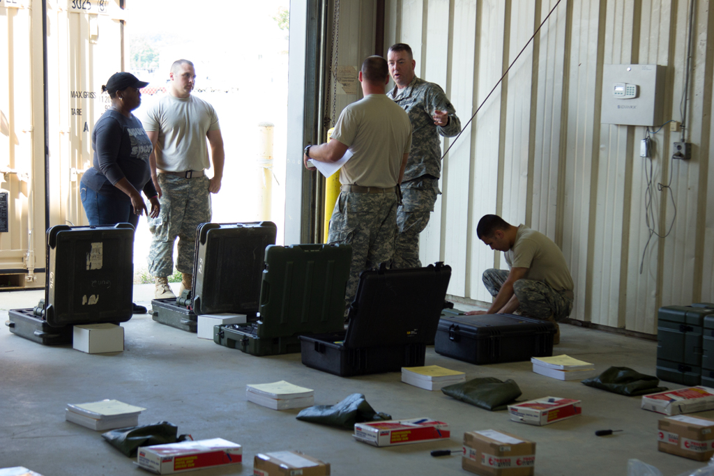 Cutline 4: Supply personnel with the 2nd Battalion, 122nd Field Artillery based in Chicago, inventory equipment being fielded to them at during their annual training period at Fort McCoy, Wisconsin July 15. . Recently the 122nd Field Artillery underwent a reorganization, gaining a new C Battery along with new M777 Howitzers, upgraded M119A3 Howitzers, and new counter-mortar radar systems. (U.S. Army National Guard photo by Staff Sgt. Bryan Spreitzer, Illinois National Guard Public Affairs)