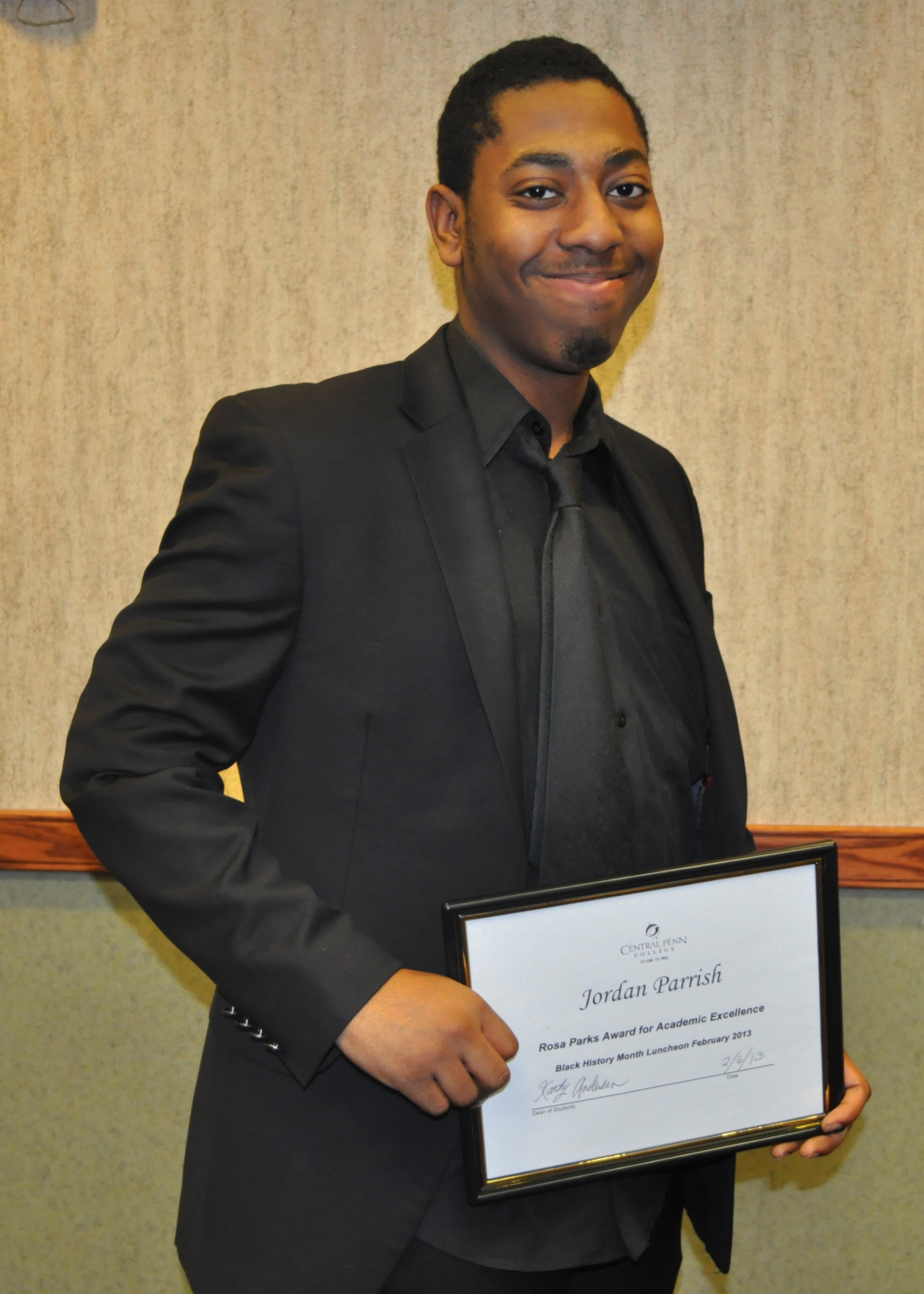 SUMMERDALE, PA (02/07/2013)(readMedia)-- Jordan Parrish of Baltimore, Md., a Central Penn College criminal justice administration student, was awarded the Rosa Parks Award for Academic Excellence.