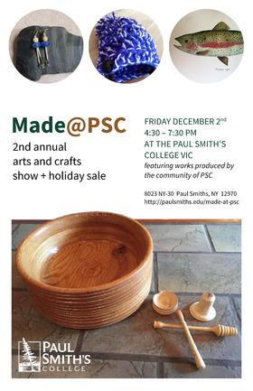PAUL SMITHS, NY (11/14/2016)(readMedia)-- Join us for an evening of art, food, music, and holiday festivity at the second annual Paul Smith's College art show and sale, hosted at the Paul Smith's College VIC. Crafts and art include woodwork, visual art, and jewelry. All pieces made by the students, faculty, and staff of Paul Smith's College.
