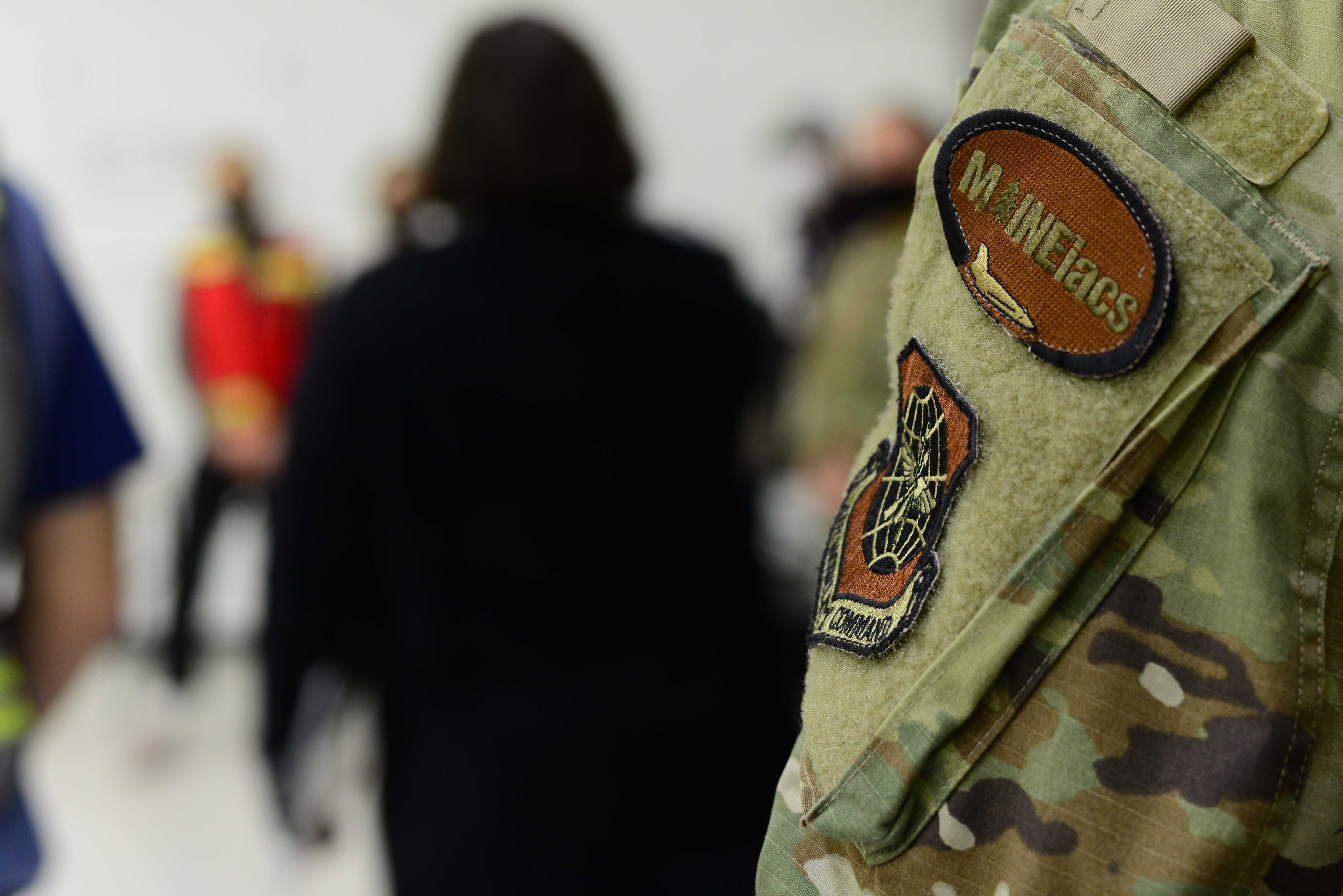 20220127-Z-XE741-005: Maine Air National Guard patches on the uniform of an Airman working at a Maine COVID-19 vaccination clinic. (Maine Air National Guard photo by Master Sgt. Travis Hill)