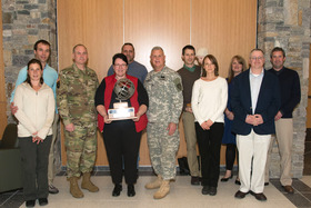20151205-Z-UR570-003 (Cutline): Members of the Maine National Guard Environmental Team were awarded the Army Reserve Environmental Stewardship Award at the 133rd Engineer Battalion Readiness Center in Brunswick on Saturday December 6, 2015. The team earned the award for their exceptional performance for Environmental Compliance, Natural and Cultural Resource Management, and National Environmental Policy. Pictured from left to right are Barry Turcotte (background), Lt. Gen. Timothy Kadavy, Elizabeth Barton, Col. Dwaine Drummond, Andrew Flint (background), Dave Foss, and Timothy Bickford (background) along with family. (U.S. Army Photo by Sgt. Adam Simmler)