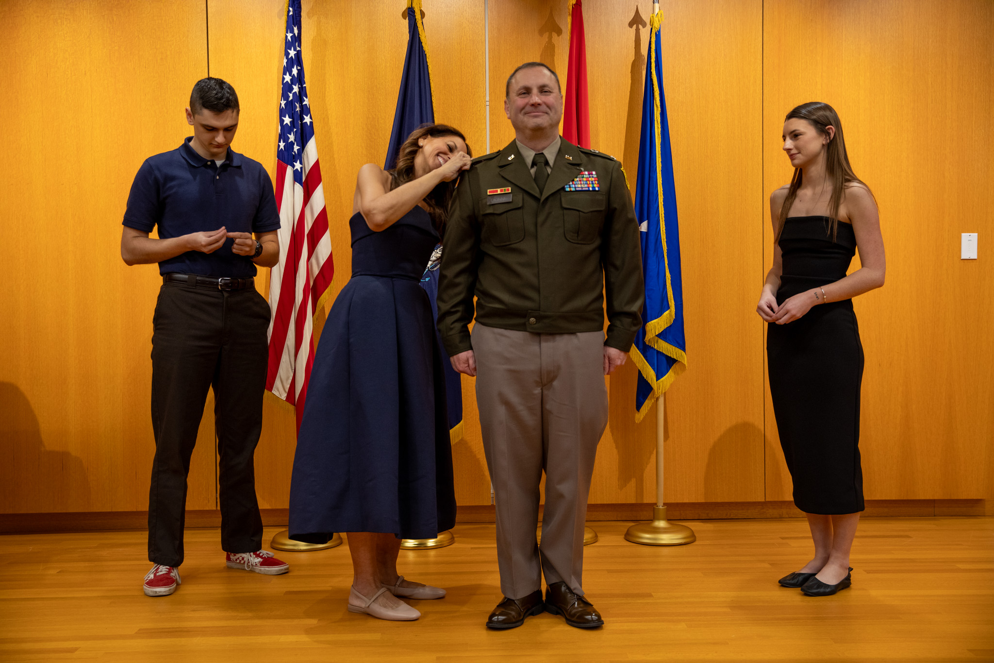 7N7A1680: Brig. Gen. William Dionne's wife, Annmarie, and his children, Paxton and Sophie, remove his Col. Rank and replace it with his "one star" rank during his promotion ceremony at Camp Chamberlain in Augusta, Maine on Nov. 2, 2024.