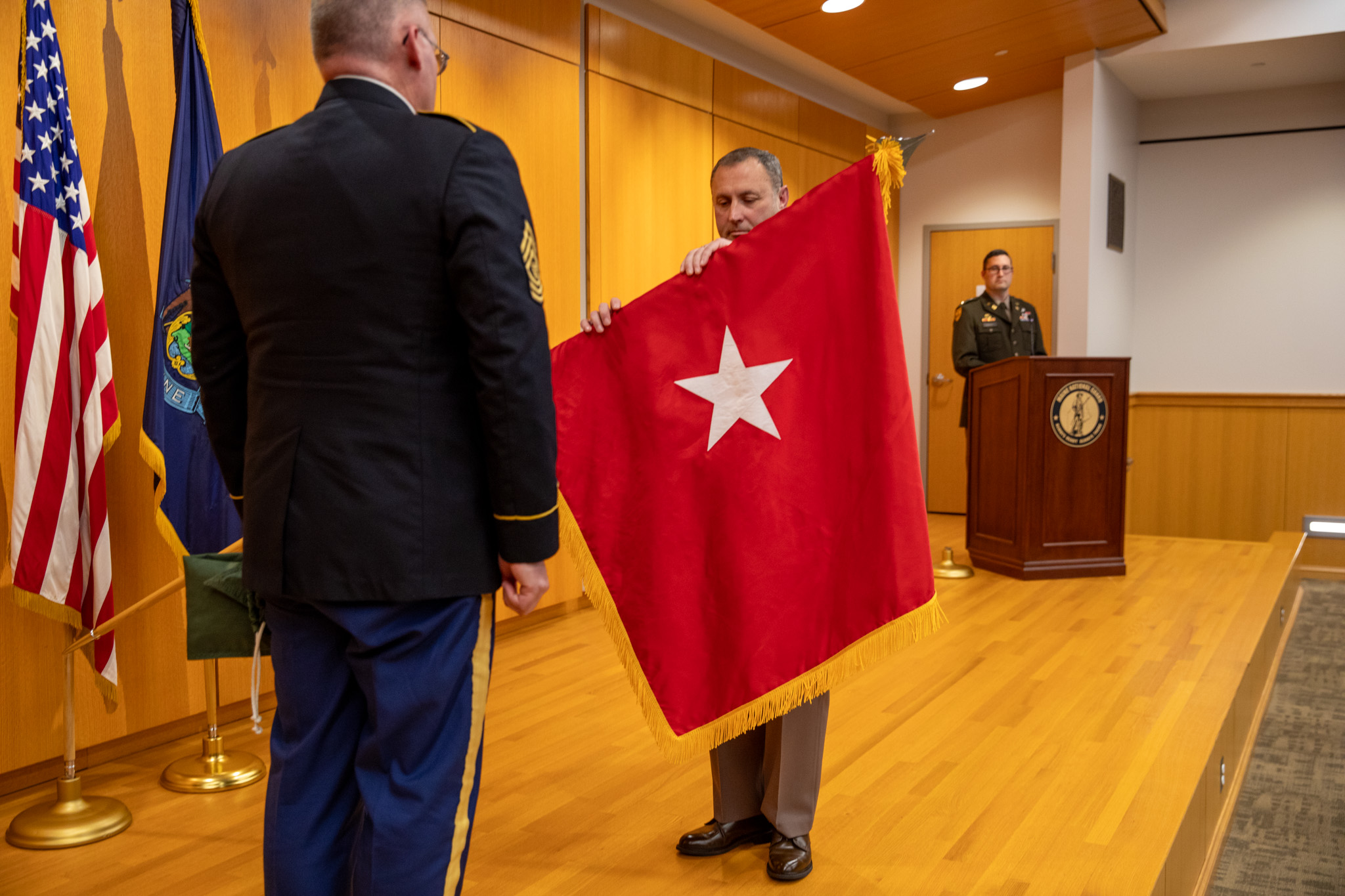 7N7A1712: The Maine Army National Guard's Command Sgt. Maj. Alex Clifford presents Brig. Gen. William Dionne with his "one star" flag during Dionne's promotion ceremony at Camp Chamberlain in Augusta, Maine on Nov. 2, 2024.