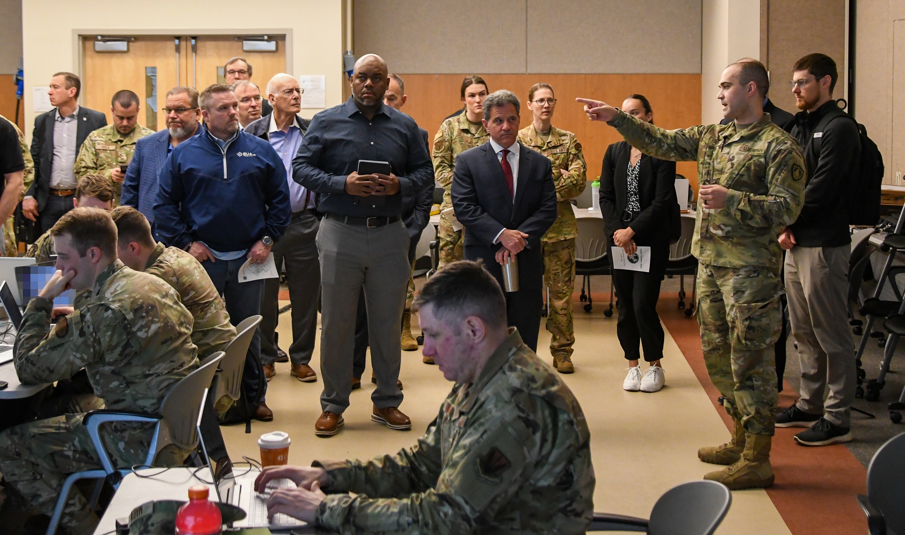 PAO_0300: Visitors receive a brief from Maj. Ethan Evans, team leader for the Maine Army National Guard's Defensive Cyber Operations Element, on May 14, 2025, during Cyber Yankee 2025, where approximately 30 members of the Maine National Guard participated in the two-week regional training exercise to hone their cybersecurity skills. The exercise was held at the New Hampshire National Guard's Edward Cross Training Complex in Pembroke, N.H, from May 5 to May 16.