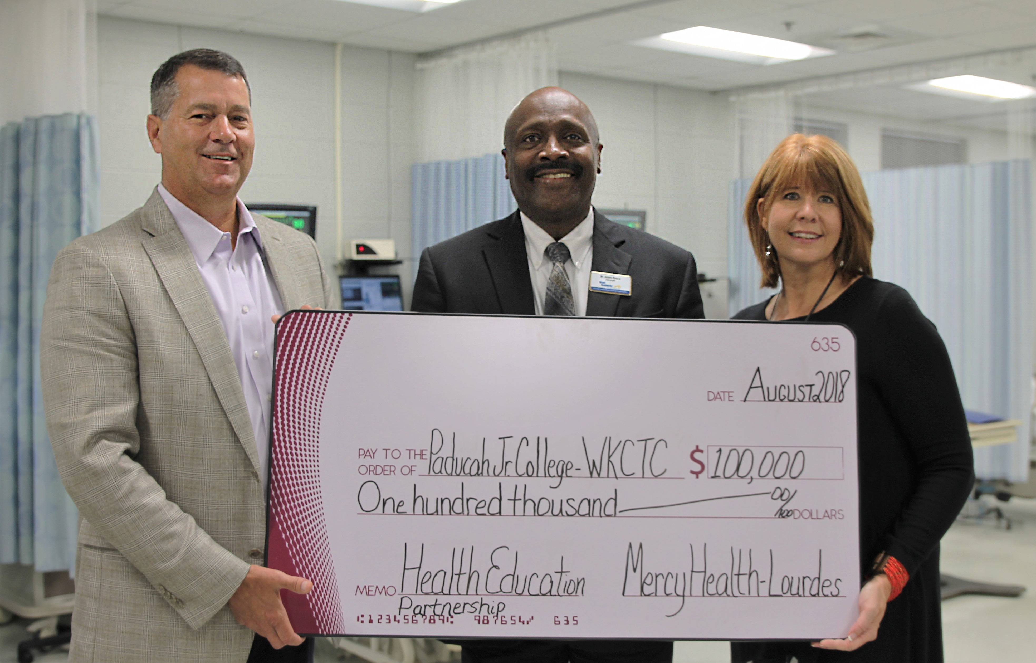 PADUCAH, KY (08/13/2018) A $100,000 gift from Mercy Health - Lourdes Hospital has given a major boost to a new Healthcare Education to Work Endowment Fund established by Paducah Junior College, Inc. (PJC), the foundation that supports West Kentucky Community and Technical College (WKCTC). The generous contribution from Mercy Health, which will also support the college's nursing program, helps ensure highly skilled nurses and allied health professionals are available to meet regional workforce demands in the healthcare industry now and into the future.