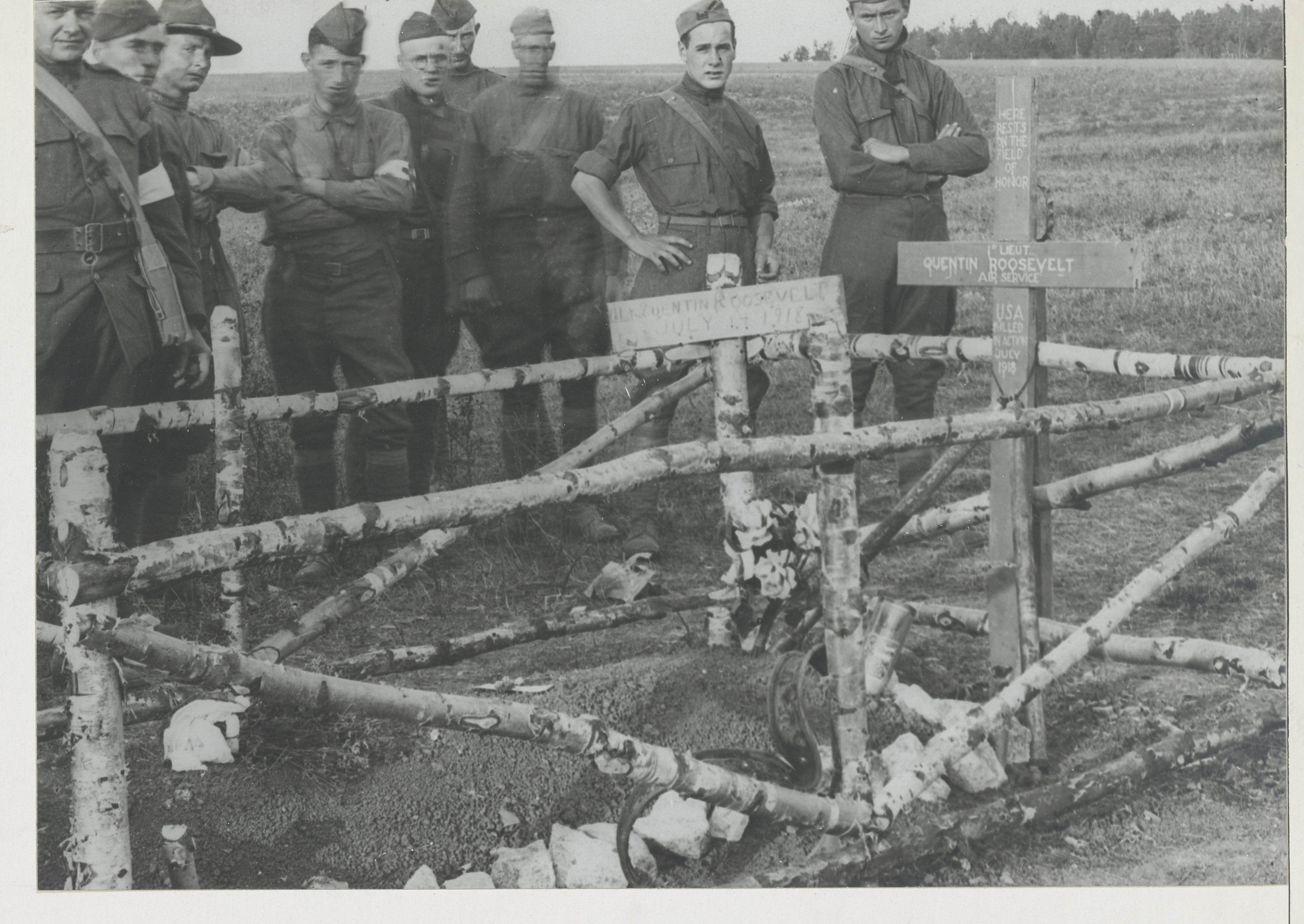 American Soldiers at Quentin Roosevelt's grave in 1918. The Germans buried him near his crashed plane. American soldiers of the 32nd division erected the fence. National Archives